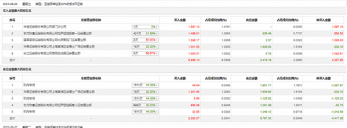 具体来看,机构买入80.18万元,卖出4076.65万元,合计净卖出3996.46万元。此外,中信证券厦门分公司、东方财富证券拉萨团结路第一证券营业部分别买入1597.13万元、1496.01万元;华泰证券上海黄浦区来福士广场证券营业部、东方财富证券拉萨团结路第二证券营业部分别卖出1639.63万元、1081.06万元。