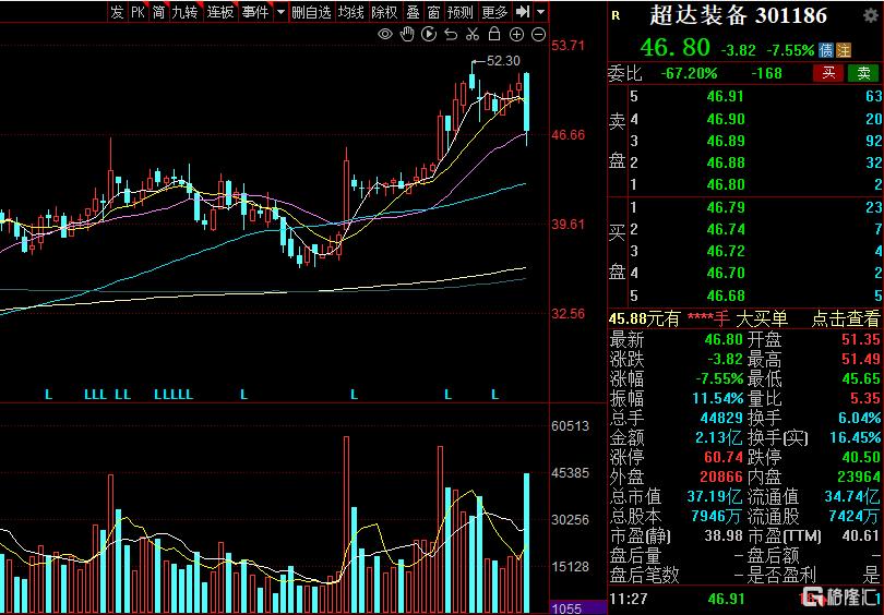 22月26日复牌后,超达装备(301186)高开后迅速翻绿,之后公司股价持续下挫,盘中跌超9%,截至午盘跌7.55%,报46.8元/股,成交额2.13亿元,最新市值37.19亿元。