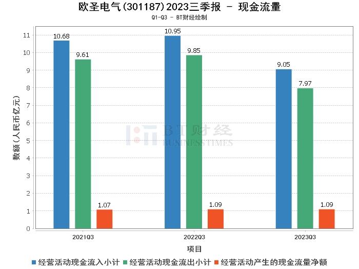 在现金流量方面,欧圣电气2023年三季度的经营活动产生的现金流量净额为1.09亿元,与上年同期的1.09亿元持平。经营活动现金流入小计为9.05亿元,相比上年同期的10.95亿元有所下降。经营活动现金流出小计为7.97亿元,相比上年同期的9.85亿元有所下降。