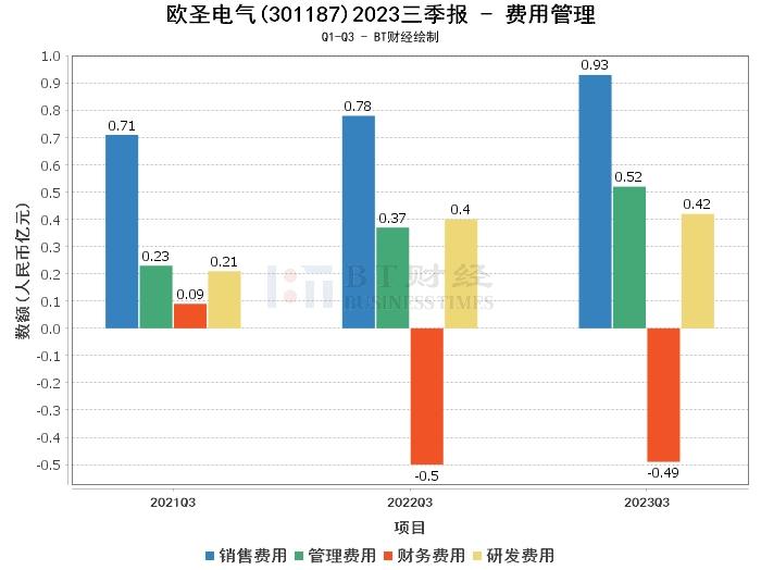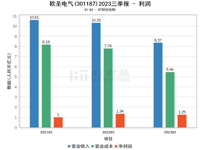 在利润方面,欧圣电气2023年三季度的营业收入为8.37亿元,相比上年同期的10.33亿元有所下降。营业利润为1.51亿元,略低于上年同期的1.59亿元。营业成本为5.46亿元,相比上年同期的7.79亿元有所降低。净利润为1.25亿元,略低于上年同期的1.34亿元。毛利率为34.74%,相比上年同期的24.54%有所提升。净利率为14.91%,相比上年同期的13.02%有所提升。