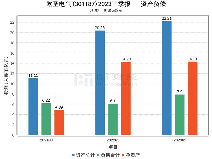 在资产负债方面,欧圣电气2023年三季度的总资产为22.21亿元,相比上年度末的20.37亿元有所增长。负债总额为7.9亿元,相比上年度末的5.86亿元有所上升。净资产为14.31亿元,略低于上年度末的14.5亿元。资产负债率为35.57%,相比上年度末的28.79%有所上升。