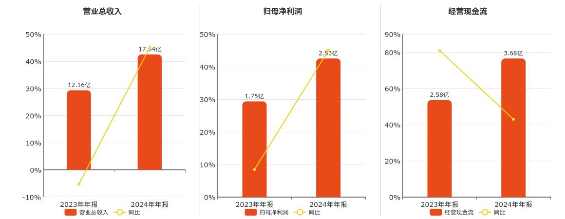 公司营业总收入为17.64亿元。归母净利润为2.53亿元。经营活动现金净流入为3.68亿元。