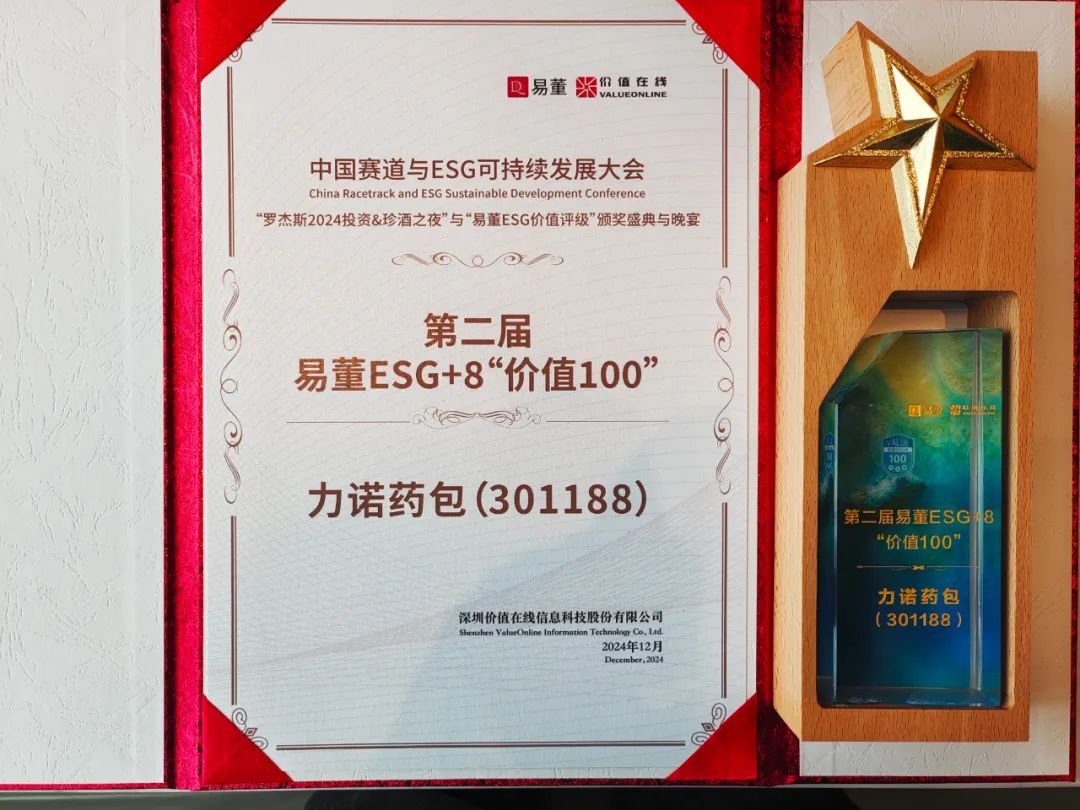 12月7日-8日,“投资光明,共创未来--中国赛道与ESG可持续发展大会”在深圳光明天安云谷国际会议中心举办,活动旨在促进绿色创新、推动ESG可持续发展促进合作与共享,探讨如何通过创新和可持续发展来推动经济增长、保护环境和改善社会福祉。力诺药包在此次活动中入选易董ESG+8“价值100”榜单,成为ESG+8评级范围覆盖的A股5000余家上市公司中,本次入选榜单的19家之一。