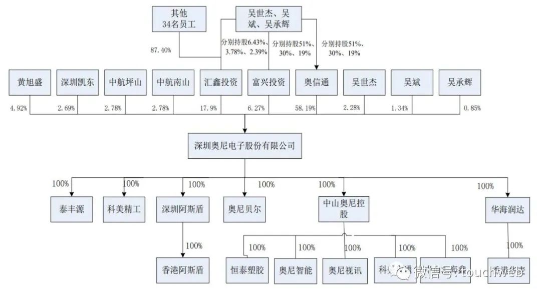 IPO前,奥信通直接持有奥尼电子4940万股,持股比例为58.19%,为奥尼电子的控股股东。