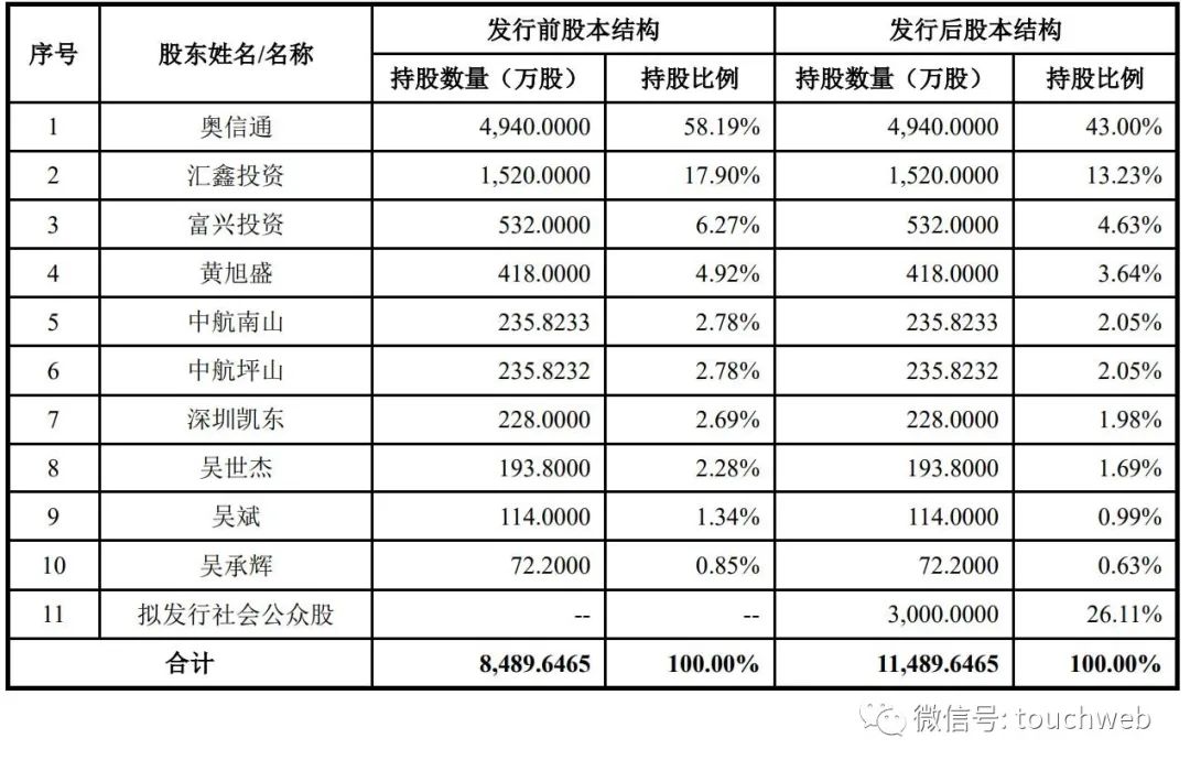 IPO后,奥信通持股为43%,汇鑫投资持股为13.23%,富兴投资持股为4.63%,黄旭盛持股为3.64%;