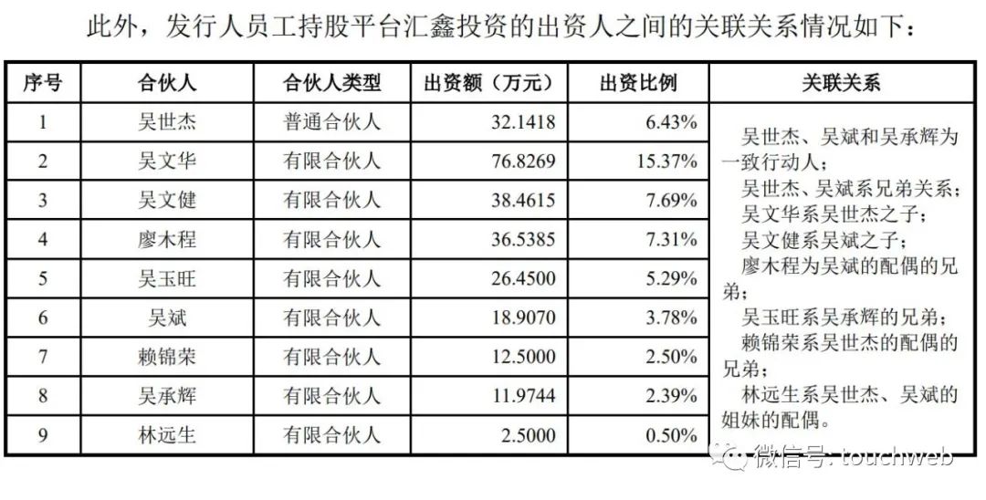吴文华持有汇鑫投资6.43%的份额,吴文华持有汇鑫投资15.37%的份额,吴文健持有汇鑫投资7.69%的份额,廖木程持有汇鑫投资7.31%的份额,吴玉旺持有汇鑫投资5.29%的份额,吴斌持有汇鑫投资3.78%的份额,赖锦荣持有汇鑫投资2.5%的份额,吴承辉持有汇鑫投资2.39%的份额。