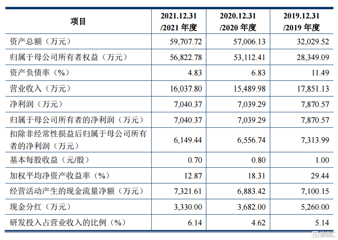 2019年至2021年,公司营收分别为1.79亿元、1.55亿元、1.6亿元,同期归母净利润为7871万元、7039万元、7040万元,存在一定波动。2022年1-3月,公司实现营收3726万元,同比下滑17.16%,同期扣非后归母净利润为1238万元,同比下降32.11%。