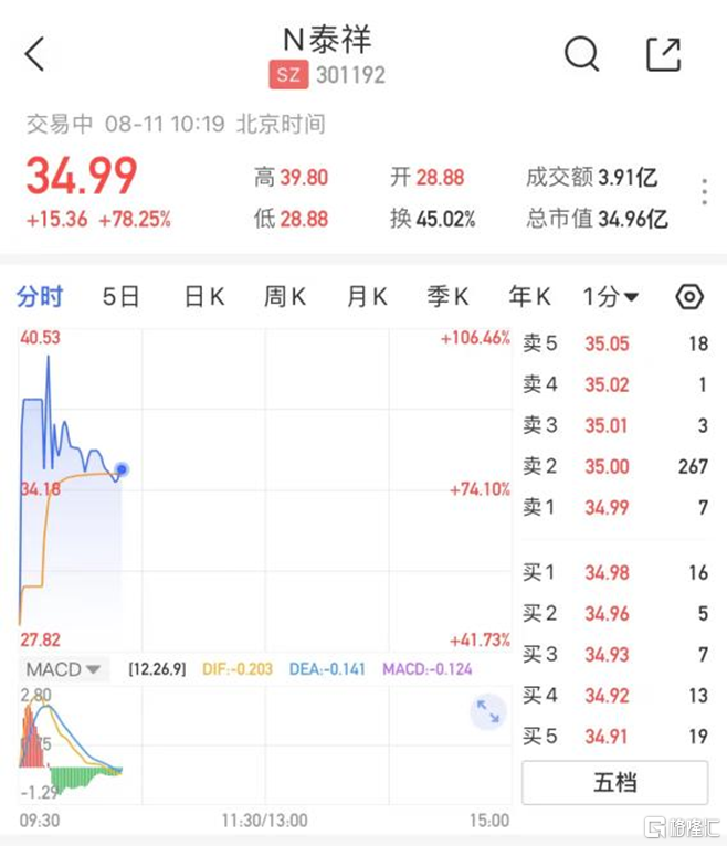泰祥股份本次发行价格为,截至发稿,上涨78.25%,报元34.99元/股,最新市值为34.96亿元。