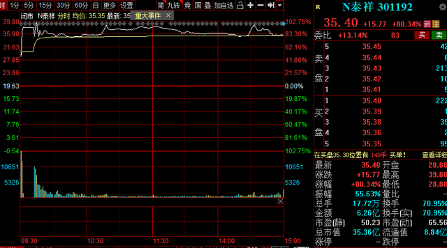 泰祥股份上市首日开盘参考价为19.63元/股(在全国股转系统最后一个有成交交易日的收盘价)。今日股价表现是,以28.88元/股高开,随后,泰祥股份股价保持高位震荡,盘中最高价达到39.8元/股,最终报收35.4元/股,上涨80.34%。日成交额为6.26亿元,换手率为70.95%。截至8月11日收盘,泰祥股份市值为35.36亿元。