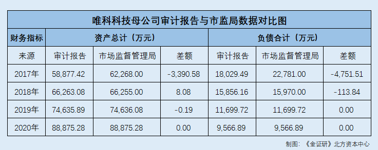 需要指出的是,唯科科技审计报告披露的母公司总资产及负债,与市场监督管理局公示的年报数据“打架”。