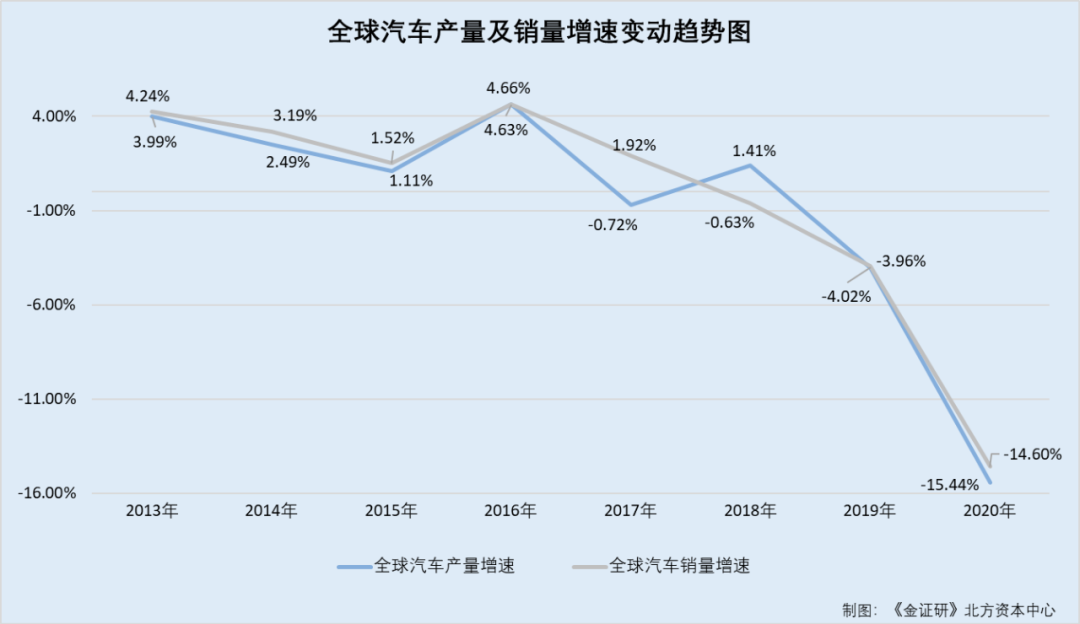 根据《金证研》北方资本中心测算,2013-2020年,全球汽车产量分别同比增长3.99%、2.49%、1.11%、4.63%、-0.72%、1.41%、-4.02%、-15.44%。