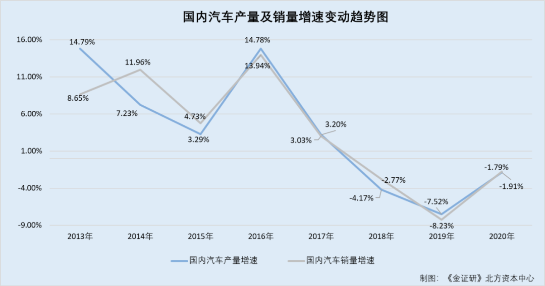 根据《金证研》北方资本中心测算,2013-2020年,国内汽车产量分别同比增长14.79%、7.23%、3.29%、14.78%、3.2%、-4.17%、-7.52%、-1.91%。