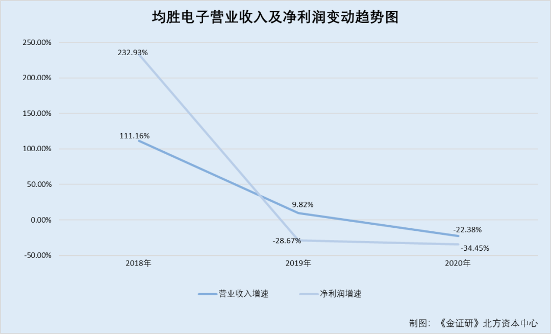 2018-2020年,均胜电子的营业收入分别同比增长111.16%、9.82%、-22.38%,净利润分别同比增长232.93%、-28.67%、-34.45%。