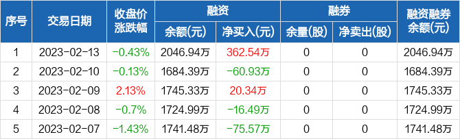 融资方面,当日融资买入475.53万元,融资偿还112.99万元,融资净买入362.54万元。融券方面,融券卖出0股,融券偿还0股,融券余量0股,融券余额0元。融资融券余额合计2046.94万元。