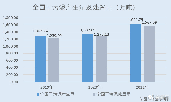 另据住建部发布的《城乡建设统计年鉴》数据,2019-2021年,全国干污泥产生量分别为1,303.24万吨、1,332.69万吨、1,621.79万吨;全国干污泥处置量分别为1,238.92万吨、1,278.02万吨、1,566.95万吨;全国干污泥处置率分别为95.07%、95.91%、96.63%。
