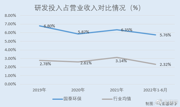 2019-2021年及2022年1-6月,国泰环保的研发投入占营收比分别为6.80%、5.87%、6.35%、5.76%。同期,国泰环保同行业可比公司鹏鹞环保、兴蓉环境、中电环保、复洁环保、军信股份、中科环保的研发投入占营收比均值分别为2.78%、2.61%、3.14%、2.32%。