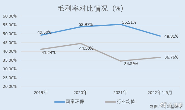 据东方财富choice数据,2019-2022年,国泰环保毛利率分别为49.30%、53.97%、55.51%、51.14%。其中,2022年1-6月,国泰环保的毛利率为48.81%。