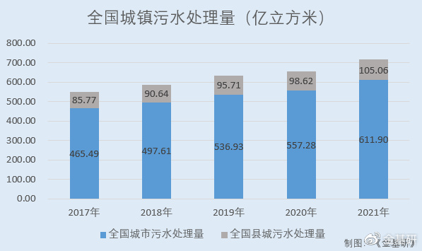 据住建部发布的《2021年城乡建设统计年鉴》数据,2017-2021年,全国城市污水处理量分别为465.49亿立方米、497.61亿立方米、536.93亿立方米、557.28亿立方米、611.90亿立方米;全国县城污水处理量分别为85.77亿立方米、90.64亿立方米、95.71亿立方米、98.62亿立方米、105.06亿立方米。
