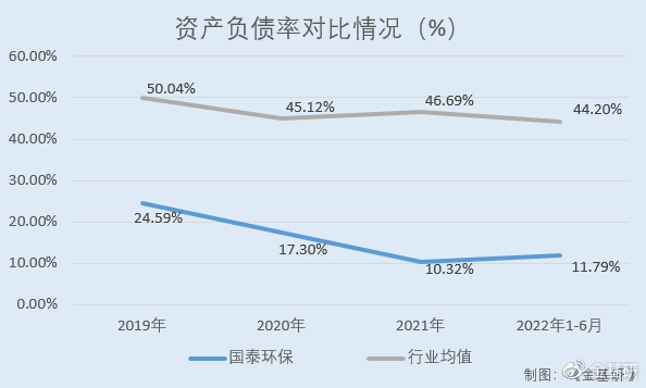 2019-2021年及2022年1-6月,国泰环保同行业可比公司鹏鹞环保、兴蓉环境、中电环保、复洁环保、军信股份、中科环保的资产负债率均值为50.04%、45.12%、46.69%、44.20%。