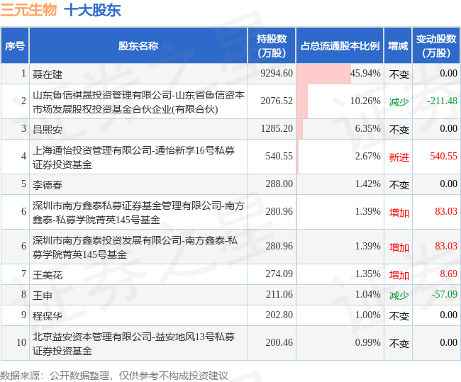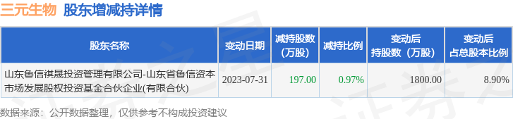 10月11日三元生物发布公告《三元生物:关于持股5%以上股东减持计划期满暨实施结果的公告》,其股东山东鲁信祺晟投资管理有限公司-山东省鲁信资本市场发展股权投资基金合伙企业(有限合伙)于2023年7月4日至2023年7月31日间合计减持197.0万股,占公司目前总股本的0.9737%,变动期间该股股价下跌7.61%,截止7月31日收盘报31.33元。