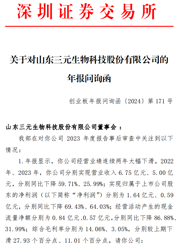 对此,深交所要求三元生物结合近两年行业发展状况、分地区业务开展情况、主要客户及销售金额变动情况、产品价格及成本变动情况、下游终端需求的变化情况及发展趋势等,并对比同行业公司情况,详细分析公司经营业绩连续两年大幅下滑的原因,相关因素是否具有持续性影响。