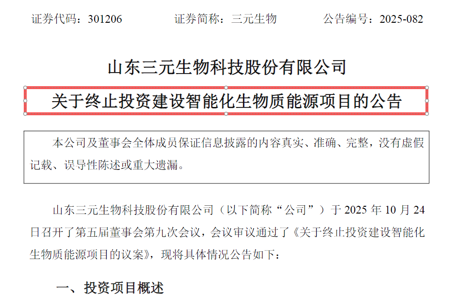 三元生物(301206.SZ)近日宣布终止2亿元智能化生物质能源项目,主要因“至今未获得主管部门批复,项目无法开工建设”。
