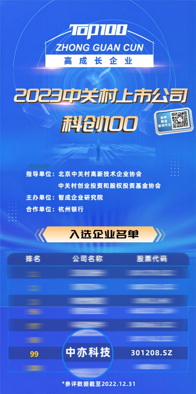 “2023中关村上市公司科创100”榜单通过对上市公司近三年的技术创新投入、创新成果产出、公司经营状况三个关键维度评价企业的科创属性,综合量化统计、差值分析以及行业趋势,形成本届榜单,遴选出北京市科创领域表现优异的上市企业。2022年7月7日中亦科技正式登陆资本市场,在第一次参选就荣登榜单,体现了政府主管部门和评选机构对中亦科技的科创性与成长性给予的充分肯定。