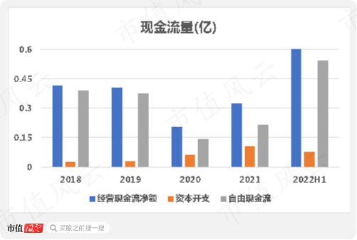 2018-22年上半年,公司通过经营活动共产生了1.9亿现金流入,资本开支仅有0.29亿,最终自由现金流净流入1.6亿。