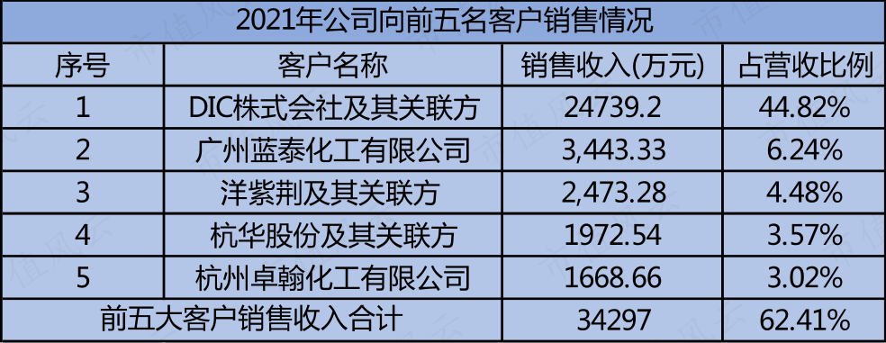 2019-21年公司对前五大客户的销售额占总营收均超60%。其中2021年对第一大客户DIC株式会社销售额高达2.4亿,占总营收的44.8%。