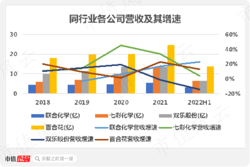 2018-21年七彩化学营收年复合增长率超30%,双乐股份和百合花也超10%,均远高于公司。