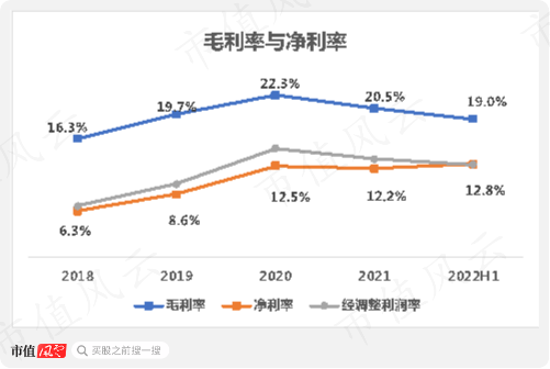 在毛利率上也有体现,公司毛利率从2021年开始下滑,2022年上半年为19%,较最高时下降了3.3个百分点。净利率走势较为一致,2022年上半年为12.8%。
