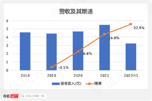 2018-21年,公司总营收从4.5亿增长到5.5亿,CAGR仅为6.9%。公司2022年上半年营收为3.2亿,同比增长22.9%。