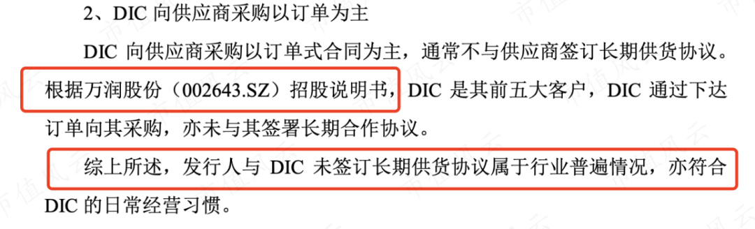 更有意思的是,公司在解释与大客户未签订长期供货协议是属于行业普遍情况时,举例说万润股份(002643.SZ)也是这样的。