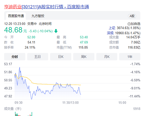作为布洛芬原料药龙头,近一个月以来,亨迪药业受到各路资金疯狂追捧,股价持续暴涨,累计涨幅超两倍。截至12月16日,亨迪药业收盘报55.63元,市值133.5亿元。但是,今日早间,新冠药物板块再度回调,亨迪药业盘中加速下跌,5分钟内跌幅超过2%。截至发稿,亨迪药业跌10.04%,报48.68元/股,总市值116.83亿元。