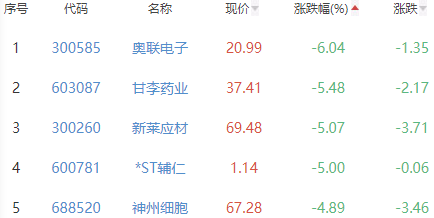 奥联电子、甘李药业、新莱应材、*ST辅仁和神州细胞位列涨幅榜后五位,涨幅分别为-6.04%、-5.48%、-5.07%、-5.00%和-4.89%。