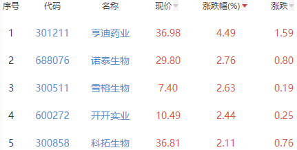 其中,亨迪药业、诺泰生物、雪榕生物、开开实业和科拓生物位列板块涨幅前五位,涨幅分别为4.49%、2.76%、2.63%、2.44%和2.11%。