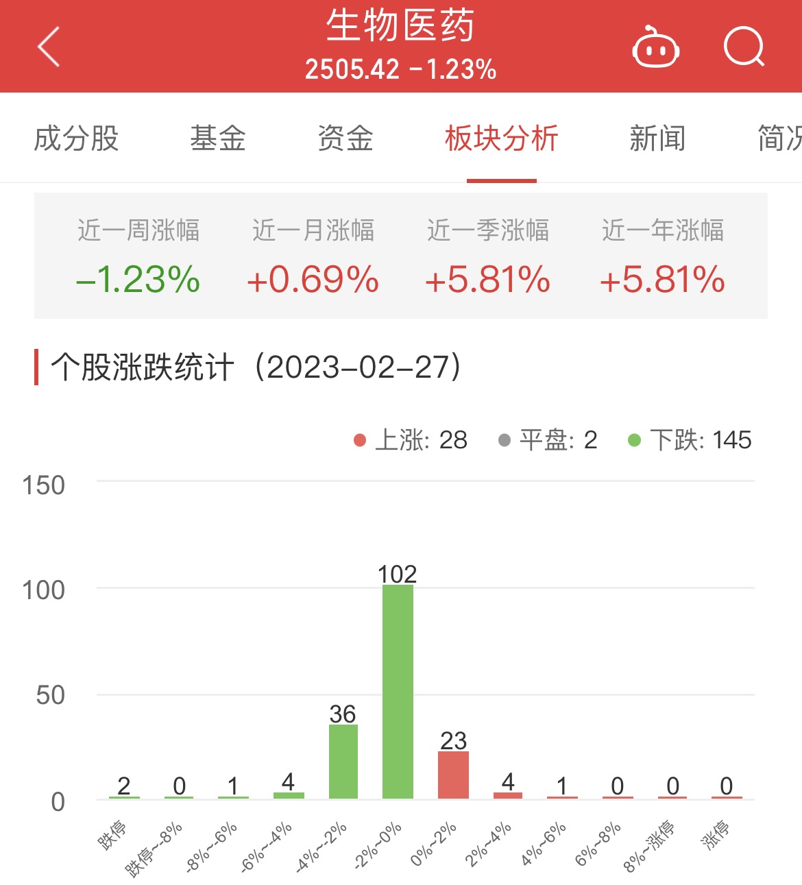 中国经济网北京2月27日讯今日,生物医药板块整体涨幅-1.23%,其中28只股票上涨,2只股票平盘,145只股票下跌。