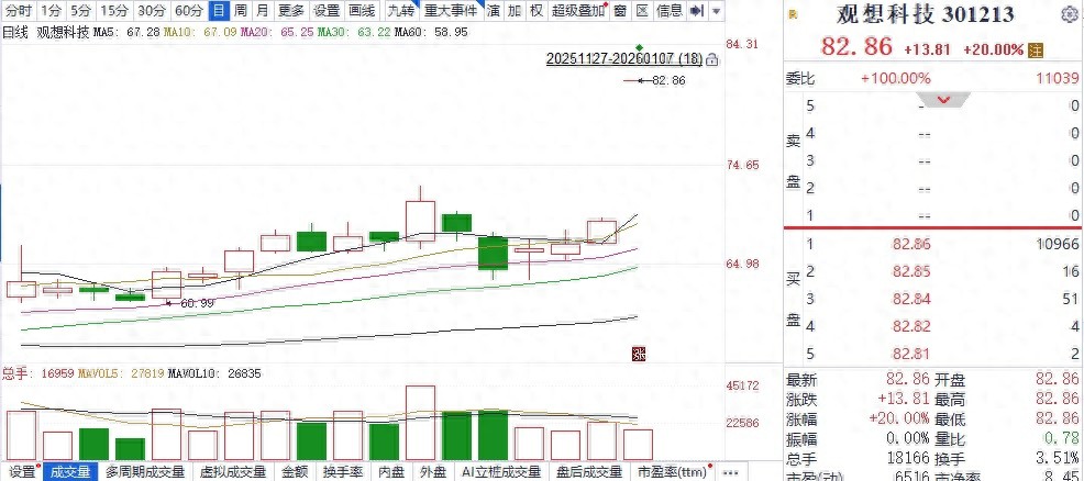 1月7日复牌当天,观想科技直接拉出“一”字涨停板,收报82.86元/股。