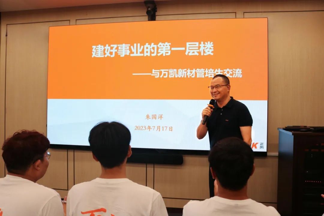 随后,集团总裁朱国洋着重介绍了正凯集团的发展战略和企业文化,为同学们上了一堂生动的战略课、文化课,帮助新员工准确把握新阶段下集团发展的主要方向和任务,在鉴往知来中勇毅前行。他鼓励大家要热爱新工作、沉下心做事、不走捷径,做得好小事、扛得住批评、经得起历练,知行合一、无知无畏,建好事业的第一层楼。