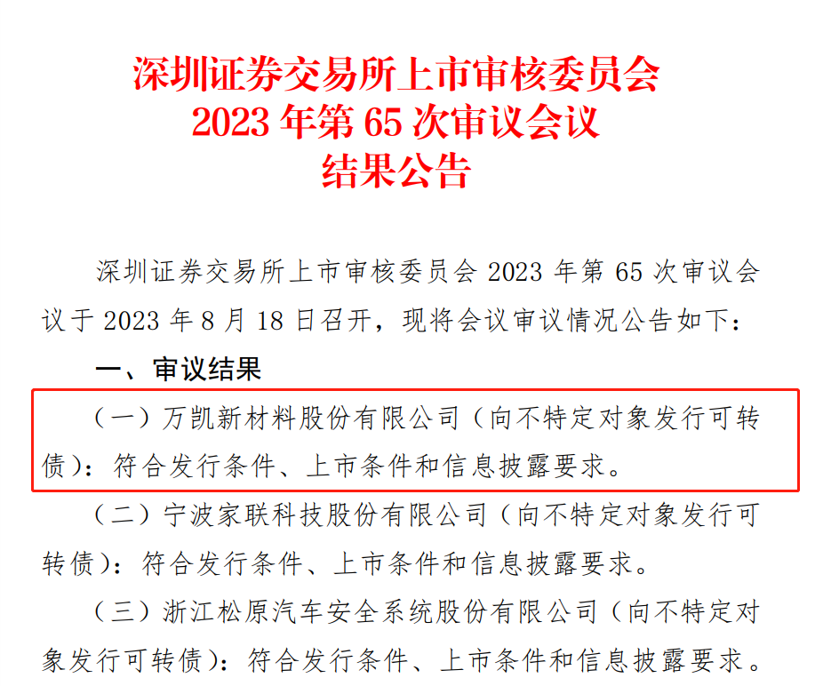 8月18日,深圳证券交易所上市审核委员会召开2023年第65次上市审核委员会审议会议。万凯新材料股份有限公司(股票代码:301216)向不特定对象发行可转债通过深交所审核。
