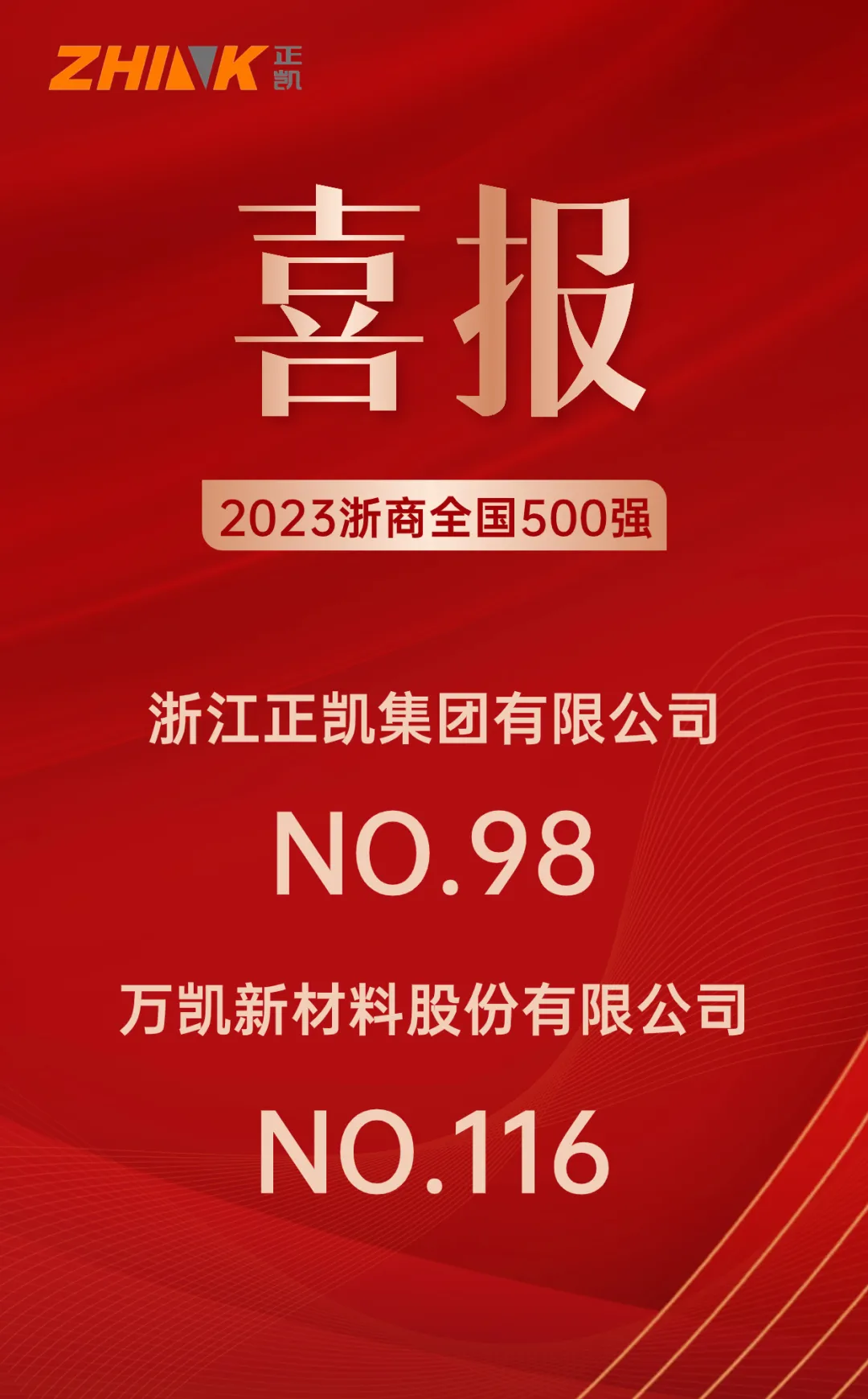 今日,有着中国民营经济晴雨表之称的“2023浙商全国500强”榜单正式发布,正凯集团排名第98位,旗下子公司万凯新材排名第116位。今年以来,集团已相继上榜“2023中国制造业企业500强”“2023中国石油和化工企业500强”“2023浙江省制造业百强企业”等榜单。