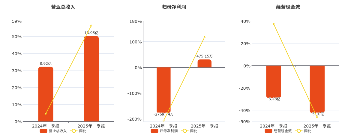 公司营业总收入为13.95亿元,较去年同报告期营业总收入增加5.02亿元,实现2年连续上涨,同比较去年同期上涨56.29%。归母净利润为475.15万元,较去年同报告期归母净利润增加3244.89万元。经营活动现金净流入为-5.10亿元。