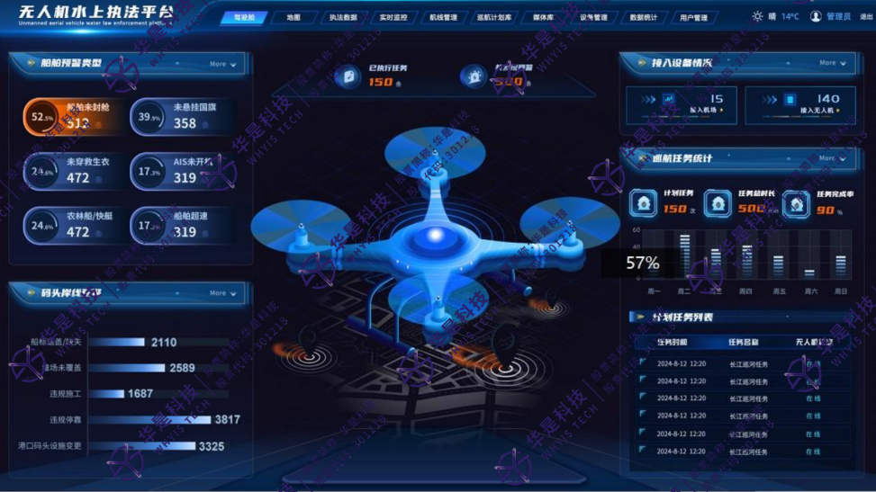 水上非现场执法无人机是华是科技联合长兴县交通运输行政执法队,根据传统水上执法依赖巡逻艇,存在覆盖范围有限、响应速度慢、人力成本高等痛点,针对大型湖泊、内河航道等广阔水域,创新引入"无人机+AI"技术,做到码头、航道、船舶在内的9大执法应用场景非现场精准执法,构建高效、精准、低成本的非现场智能执法体系,实现水域监管的数字化升级。