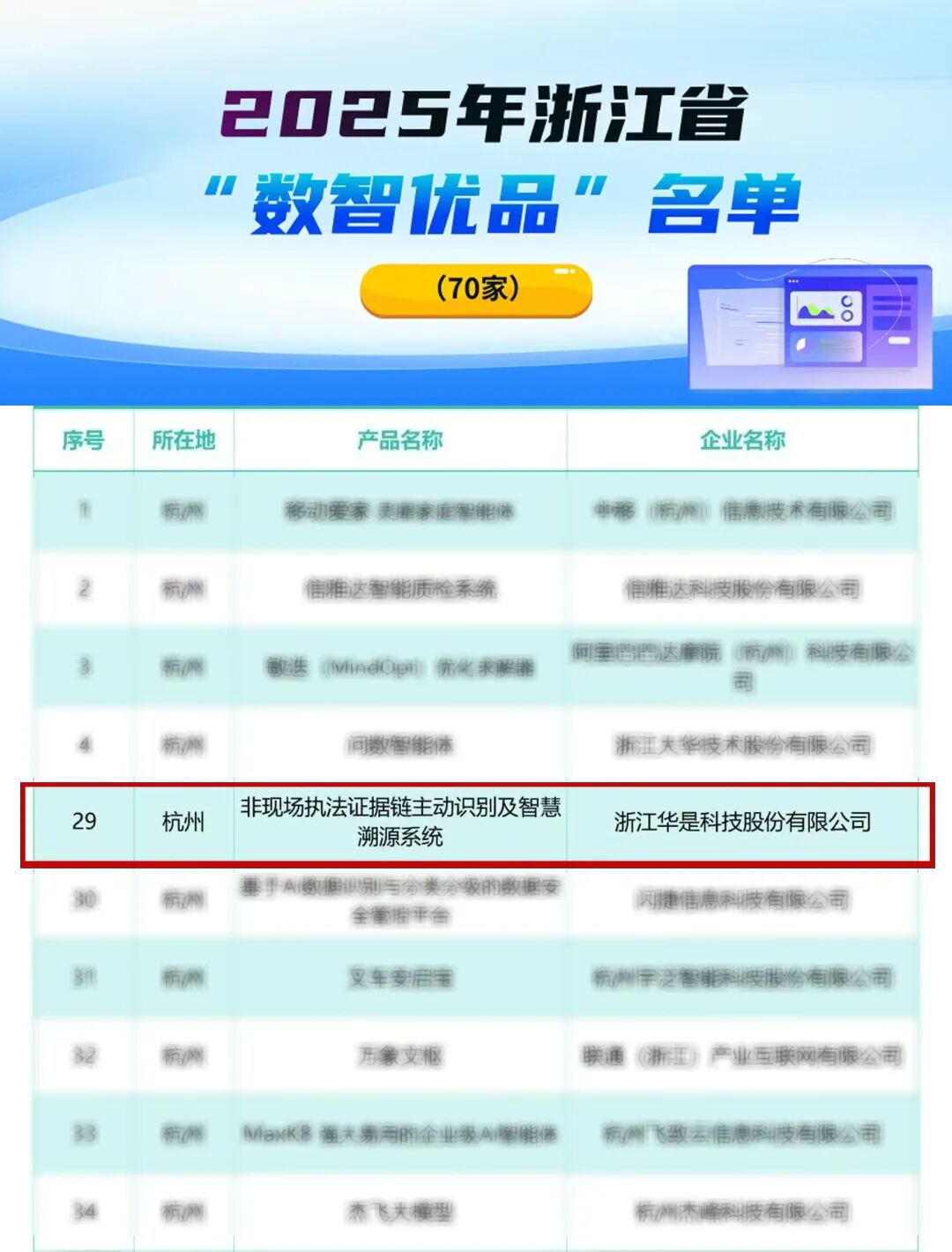 为贯彻落实好国务院深入实施“人工智能+”行动的战略部署,全面推进人工智能赋能新型工业化,加快推动人工智能创新应用,赋能产业深度转型,10月11日,浙江省经信厅公布了2025年浙江省“数智优品”名单,华是科技非现场执法证据链主动识别及智慧溯源系统成功入选,标志着公司在人工智能与智慧港航非现场执法融合领域获权威认可。