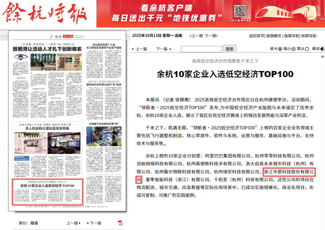 在近日成功举办的2025浙商低空经济合作周上,“领航者·2025低空经济TOP100”权威榜单正式发布。浙江华是科技股份有限公司凭借其在低空经济领域的技术创新与突出贡献,成功入选该百强榜单,并与余杭区内龙头企业阿里巴巴等共十家优秀企业一同代表了余杭在低空经济赛道上的强劲竞争力。