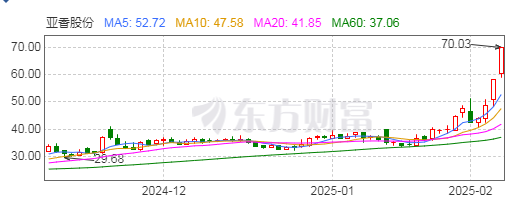 2月11日收盘,亚香股份(301220)涨20%,报收70.03元,换手率18.95,成交量892.89万股,成交额5.80亿元。公司于2月6日、2月7日、2月10日连续三个交易日收盘价格涨幅偏离值累计超过30%。近3个月,公司股价暴涨超130%。