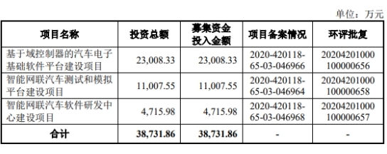 光庭信息本次发行募集资金总额为16.18亿元,扣除发行费用后,募集资金净额为14.79亿元,比原计划多10.91亿元。光庭信息于12月17日披露的招股书显示,公司拟募集资金3.87亿元,分别用于基于域控制器的汽车电子基础软件平台建设项目、智能网联汽车测试和模拟平台建设项目、智能网联汽车软件研发中心建设项目。