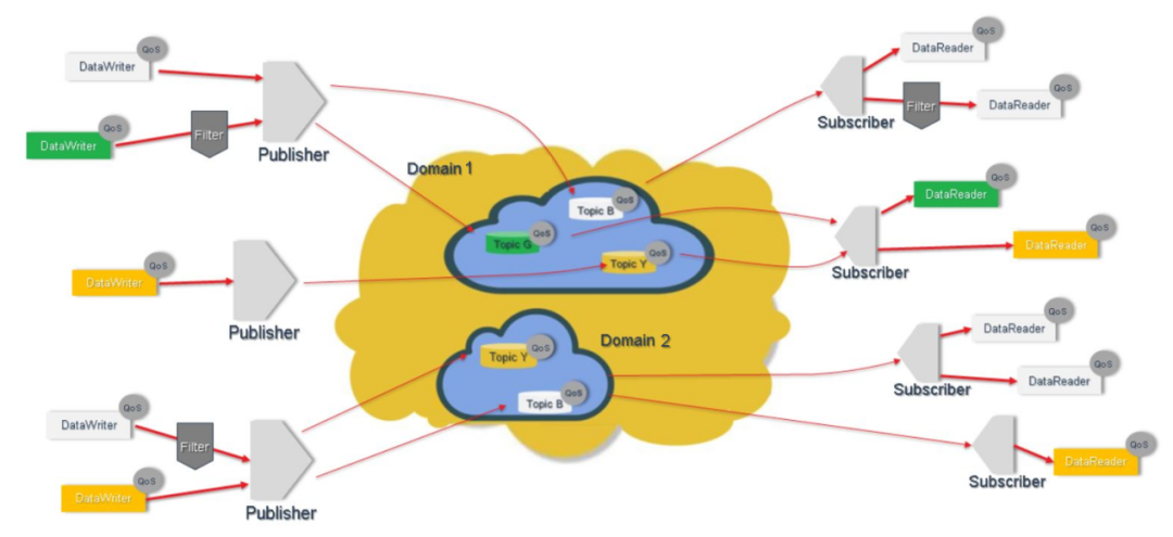 域(Domain): DDS的通信范围由域定义,域是逻辑上的隔离区域,只有属于同一域的参与者才能进行数据通信。