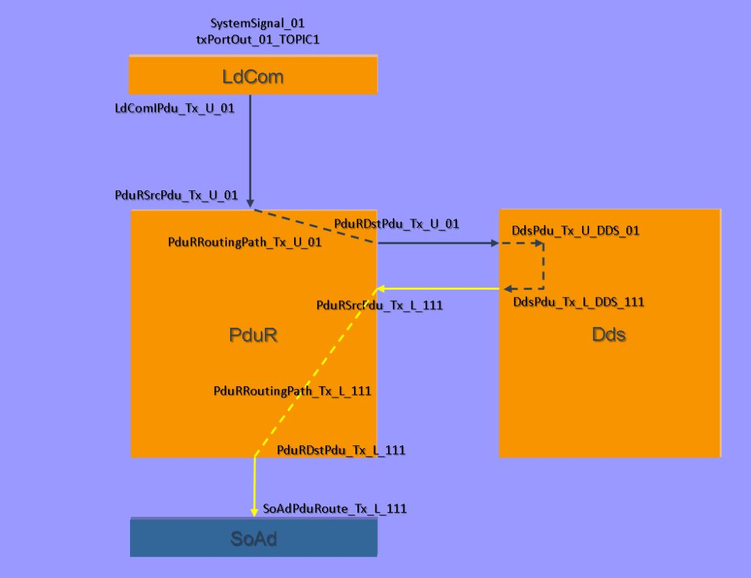 AUTOSAR CP中的DDS作为一个BSW组件被集成进来,它与其他组件的完整传输路径如下(参考AUTOSAR_CP_SWS_DDS规范):