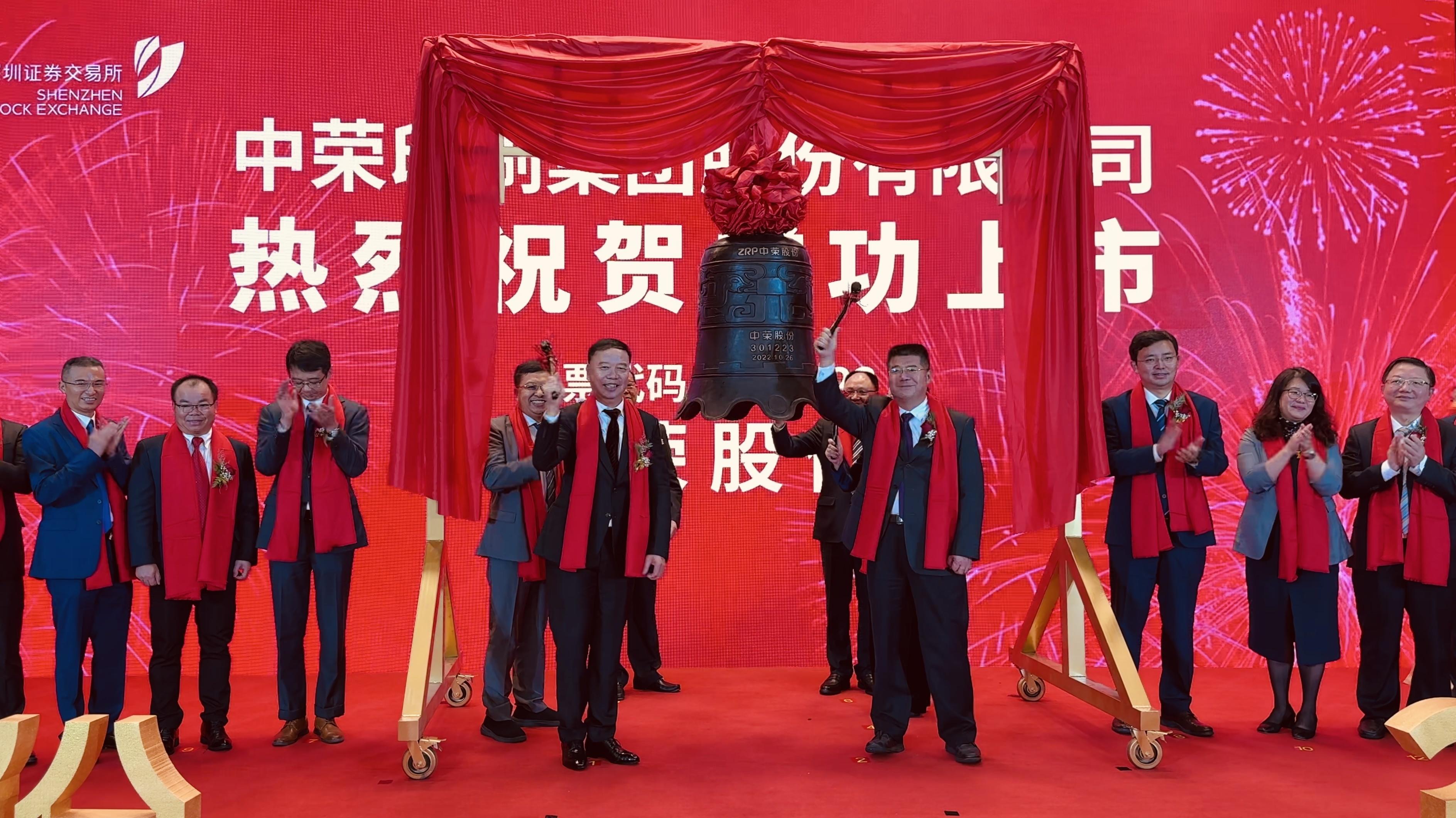 仪式上,随着钟声敲响,中荣股份完成了首次公开发行A股股票。通过云直播连线深交所,到场嘉宾共同见证了中荣股份登陆深交所的重要时刻。